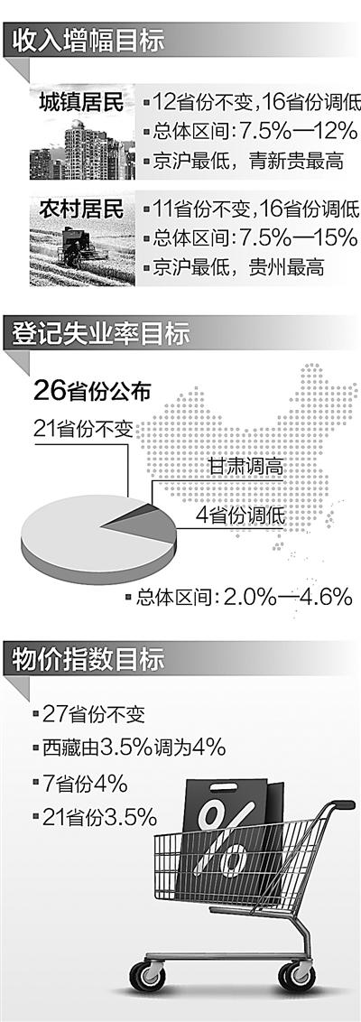 截至1月23日,除了安徽、海南、湖南,全国共有28个省份召开两会。梳理各地政府工作报告可以发现,紧扣经济增长目标,各地居民收入、物价指数、登记失业率等指标也作了相应调整。整体表现为:收入增幅目标调低,物价调控目标保持稳定,登记失业率目标变化不大。