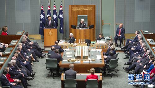 11月17日,国家主席习近平在澳大利亚联邦议会发表题为《携手追寻中澳发展梦想-并肩实现地区繁荣稳定》的重要演讲。新华社记者谢环驰摄