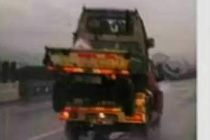 两辆小货车高速上玩“叠罗汉”为省通行费