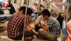 四个小伙乘地铁 席地而坐切磋牌技