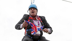 伦敦市长玩飞索庆首金 被悬挂半空