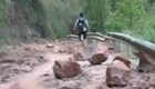 实拍:救援队顶飞沙滚石行进 道路艰难