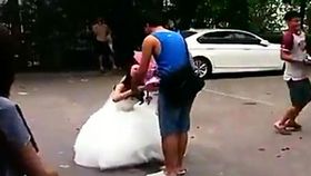 女大学生穿婚纱跪地向男友求婚