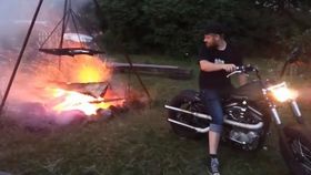 搞笑:男子用摩托车把火堆吹旺