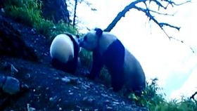 野生大熊猫母子过山冈“温馨”一幕
