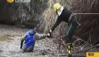 民警捆绳踩浮木救人