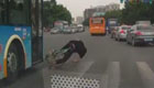 实拍小伙子骑"死飞"闯红灯被公交车撞飞