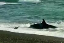 虎鲸借助海浪冲上岸捕食海狮