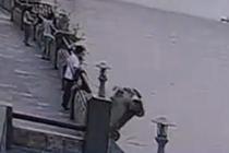 监拍倒车失控翻入江中