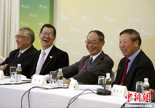 4月8日,博鳌亚洲论坛两岸企业家圆桌会议举行,图为全国社保基金理事会党组书记戴相龙(右一)、台湾两岸共同市场基金会荣誉董事长萧万长(左二)、台湾两岸共同市场基金会最高顾问钱复(右二)出席会议谈笑风生。中新社发 张浩 摄
