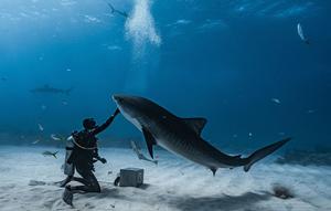 男子水下抚摸鲨鱼