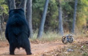 黑熊站立对视老虎