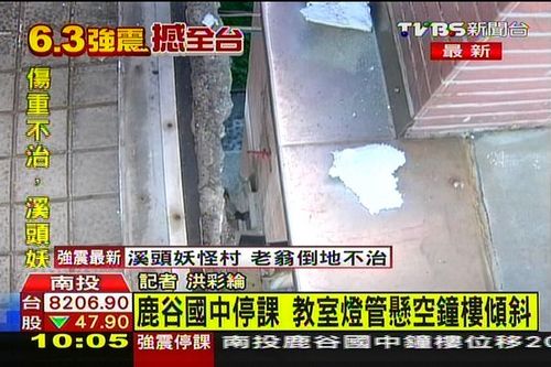 中新网6月3日电 据台湾TVBS网站报道,6月2日13时43分,台湾南投县(北纬23.9度,东经120.9度)发生6.7级地震(台湾岛内气象部门测定为6.3级),震源深度9.0公里。南投鹿谷中学也受到地震影响,校园内多处毁损,3日停课一天。